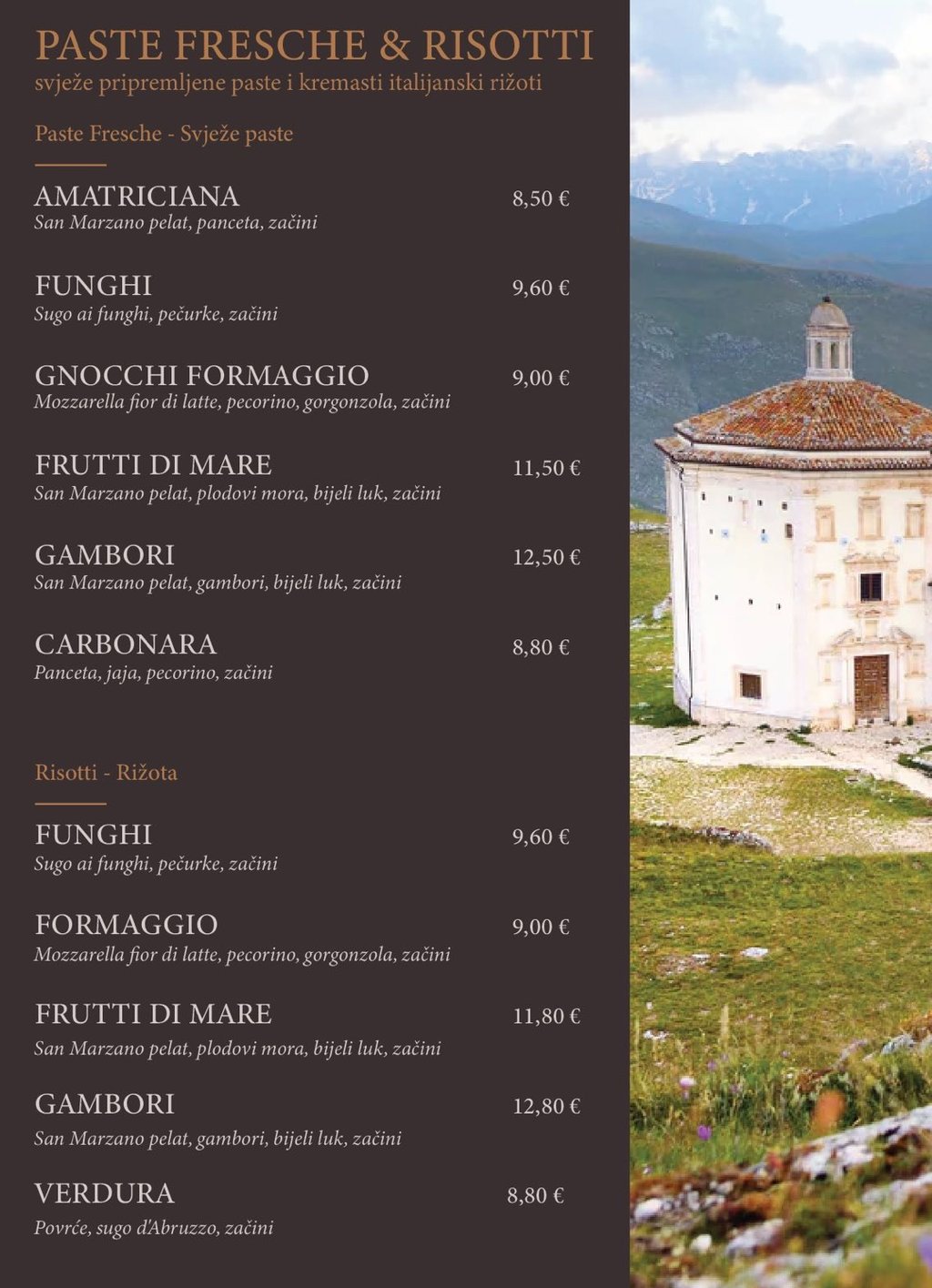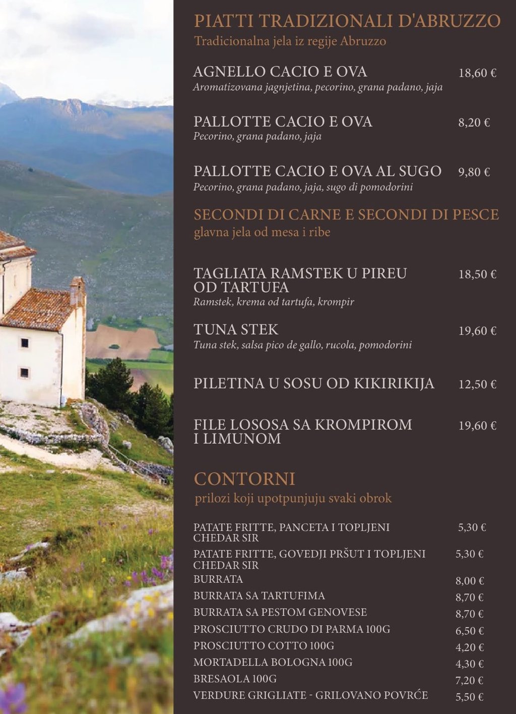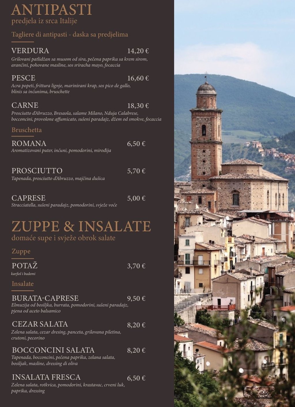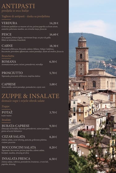 Naš jelovnik nudi pažljivo odabrana jela – od predjela i glavnih jela do autentičnih pizza i slatkih italijanskih delicija – sve pripremljeno od svježih sastojaka, s ljubavlju i znanjem.