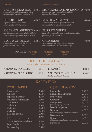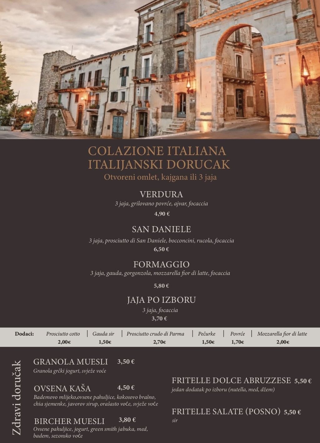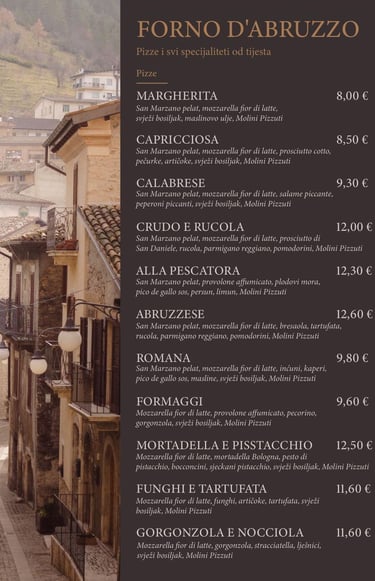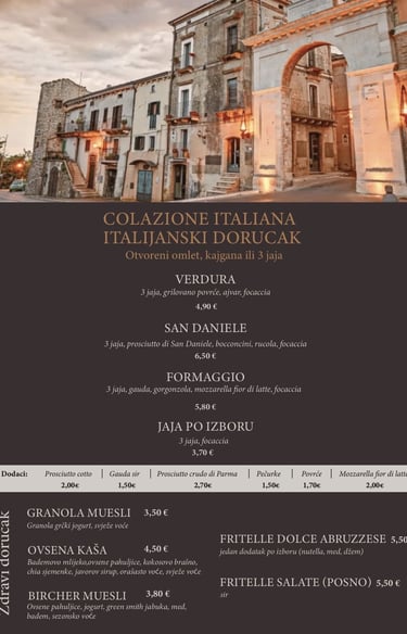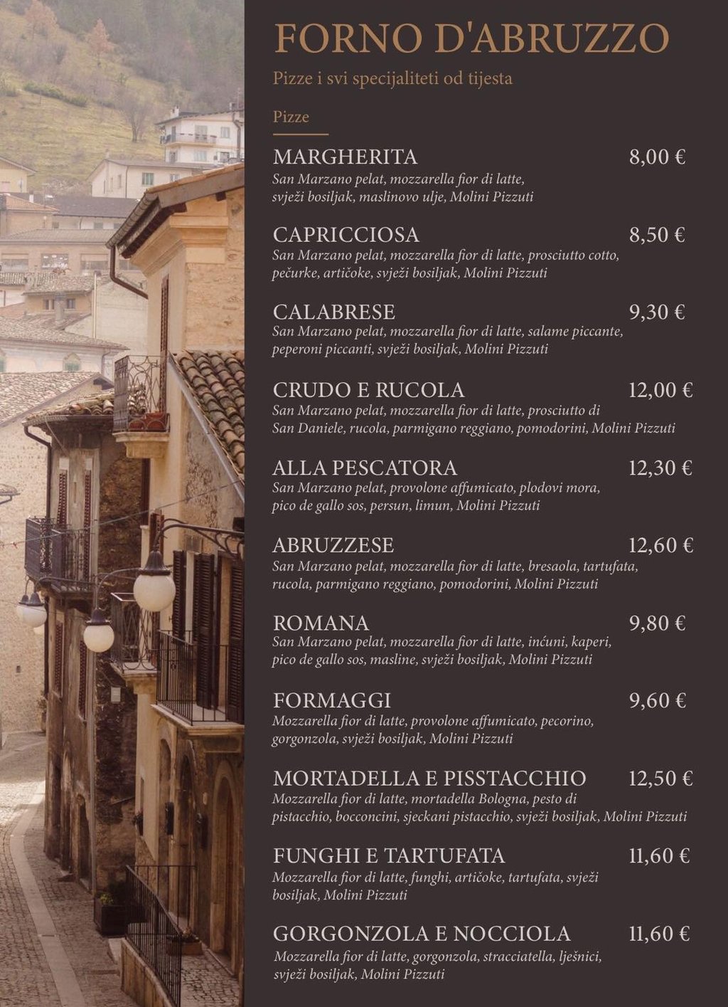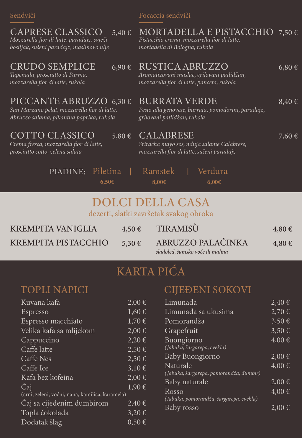 Naš jelovnik nudi pažljivo odabrana jela – od predjela i glavnih jela do autentičnih pizza i slatkih italijanskih delicija – sve pripremljeno od svježih sastojaka, s ljubavlju i znanjem.